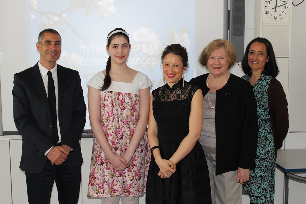 Le Conseiller Culturel, monsieur Georges Diener a remis de la part de l’ambassade un bel ouvrage devant les camarades, la mère de la lauréate, la directrice adjointe pour le français, madame Marie-Aude Boucher, l’Attachée de coopération pour le français madame Sophie Cécilia et la présidente de l’association AMOPA de Finlande, madame Claude Anttila.