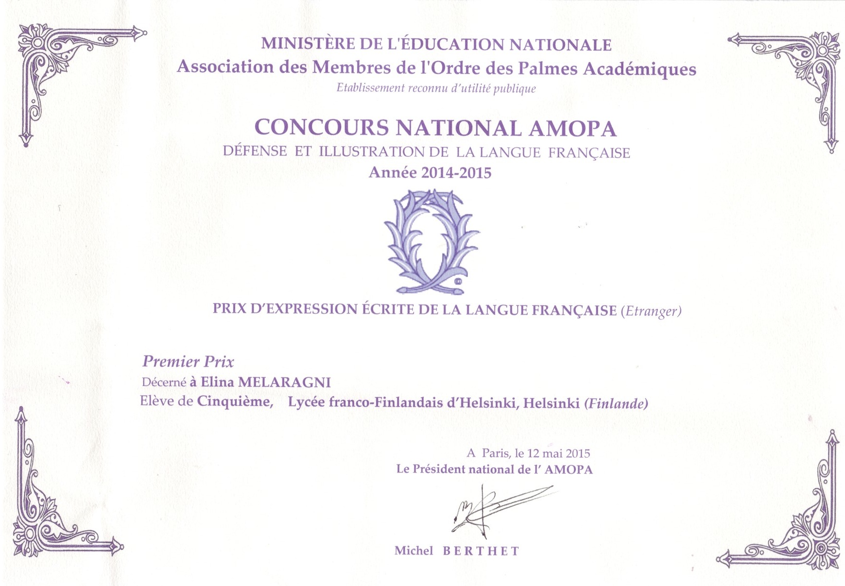 - Le samedi 30 mai, jour de la distribution des bulletins et des prix dans toutes les écoles, collèges et lycées de Finlande, le premier prix d’expression écrite de la langue française de l’AMOPA a été décerné à une jeune collégienne du lycée franco-finlandais d’Helsinki de classe 7, mademoiselle Elina MELARAGNI.