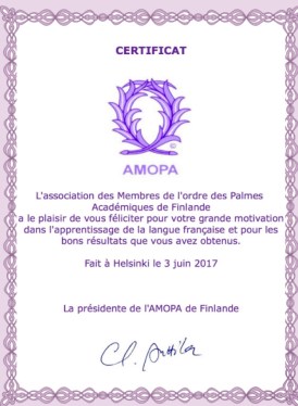 En accord avec plusieurs membres de l’AMOPA-Finlande en activité, il a été décerné un certificat mentionnant la motivation envers la langue française des élèves. Le certificat a été envoyé aux membres, mais sera transmis l’année prochaine à tous les professeurs de français de Finlande enseignant à tous les niveaux par le biais de l’APFF (Association des professeurs de français de Finlande).