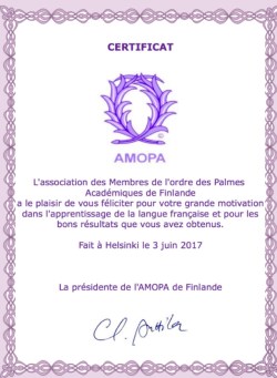En accord avec plusieurs membres de l’AMOPA-Finlande en activité, il a été décerné un certificat mentionnant la motivation envers la langue française des élèves. Le certificat a été envoyé aux membres, mais sera transmis l’année prochaine à tous les professeurs de française de Finlande enseignant à tous les niveaux par le biais de l’APFF (Association des professeurs de français de Finlande).